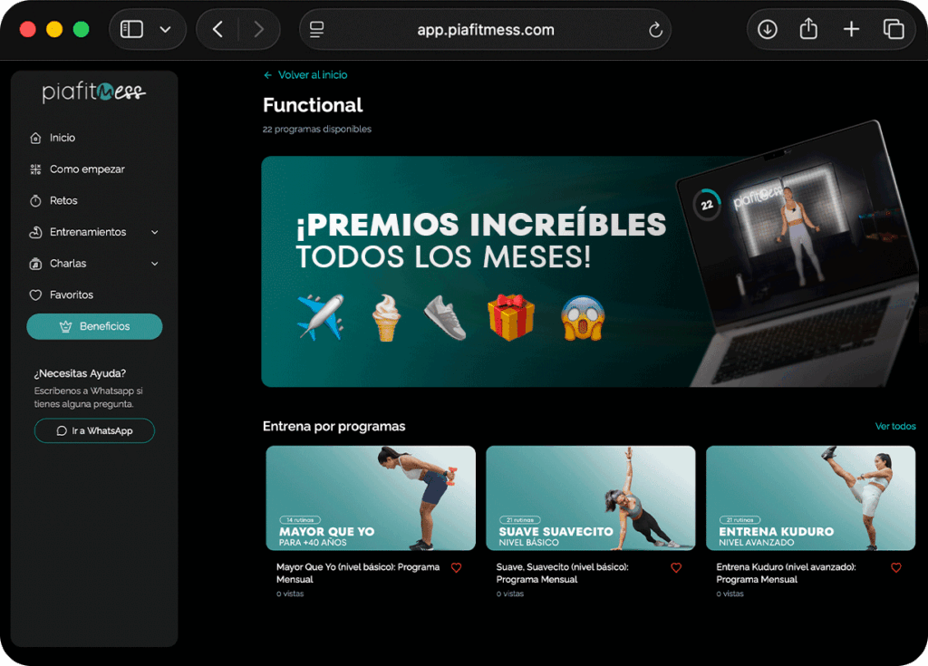 Videos de rutinas todas la semanas, programas completos para que los hagas las veces que quieras, videos con técnica de ejercicio, charlas de salud mental y nutrición, recetario y beneficios en marcas aliadas locales.